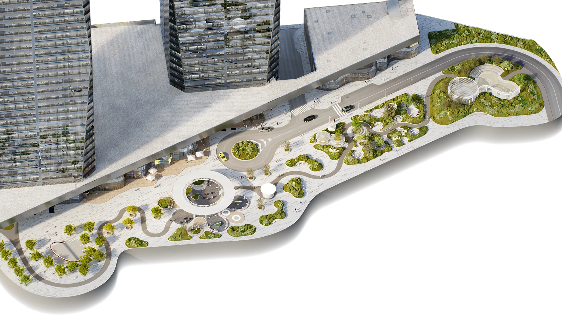 Место встреч, отмеченное впечатляющей инсталляцией. Здесь начинается пешеходный бульвар, проходящий вдоль комплекса.