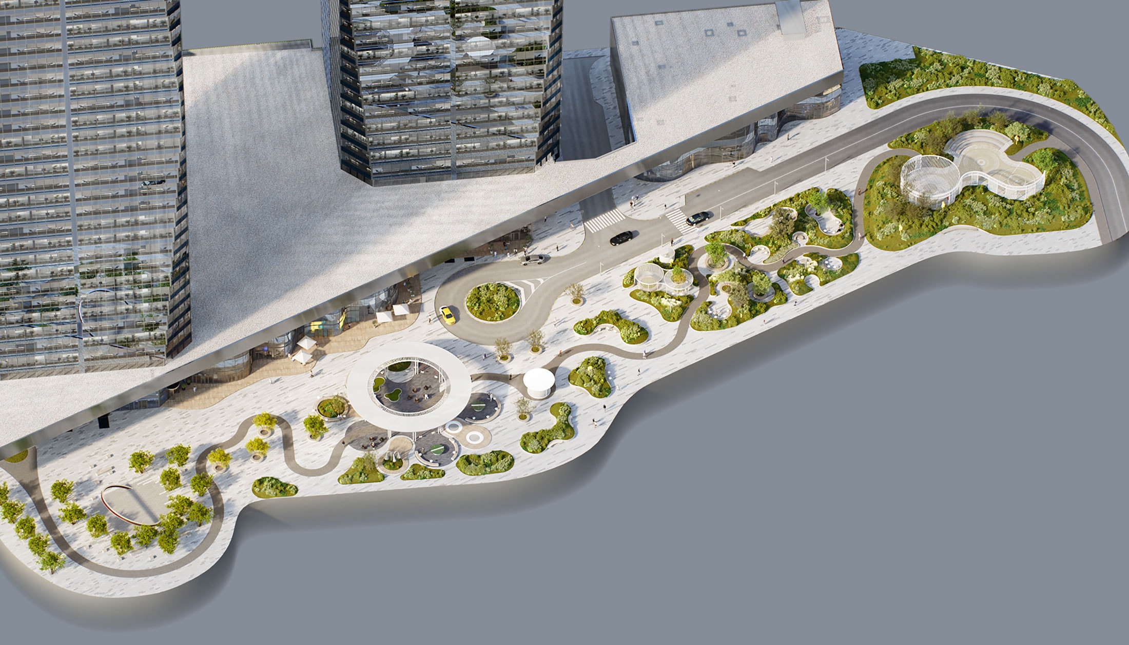Место встреч, отмеченное впечатляющей инсталляцией. Здесь начинается пешеходный бульвар, проходящий вдоль комплекса.