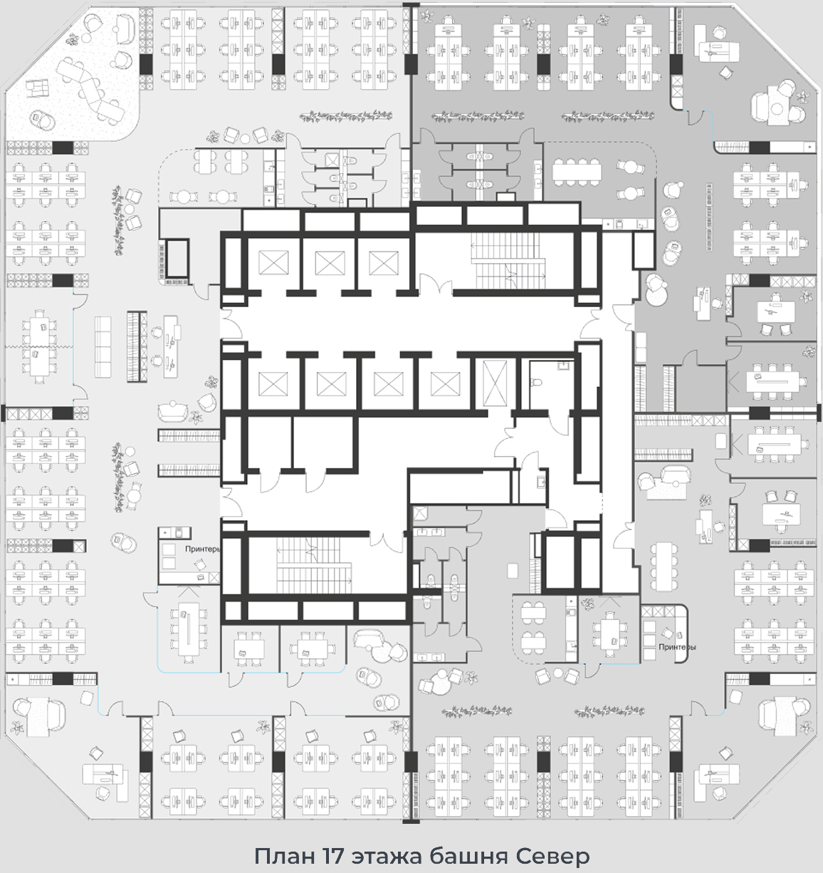 В каждом офисе предусмотрены санузел, место для приема пищи, комната для уборочного инвентаря.