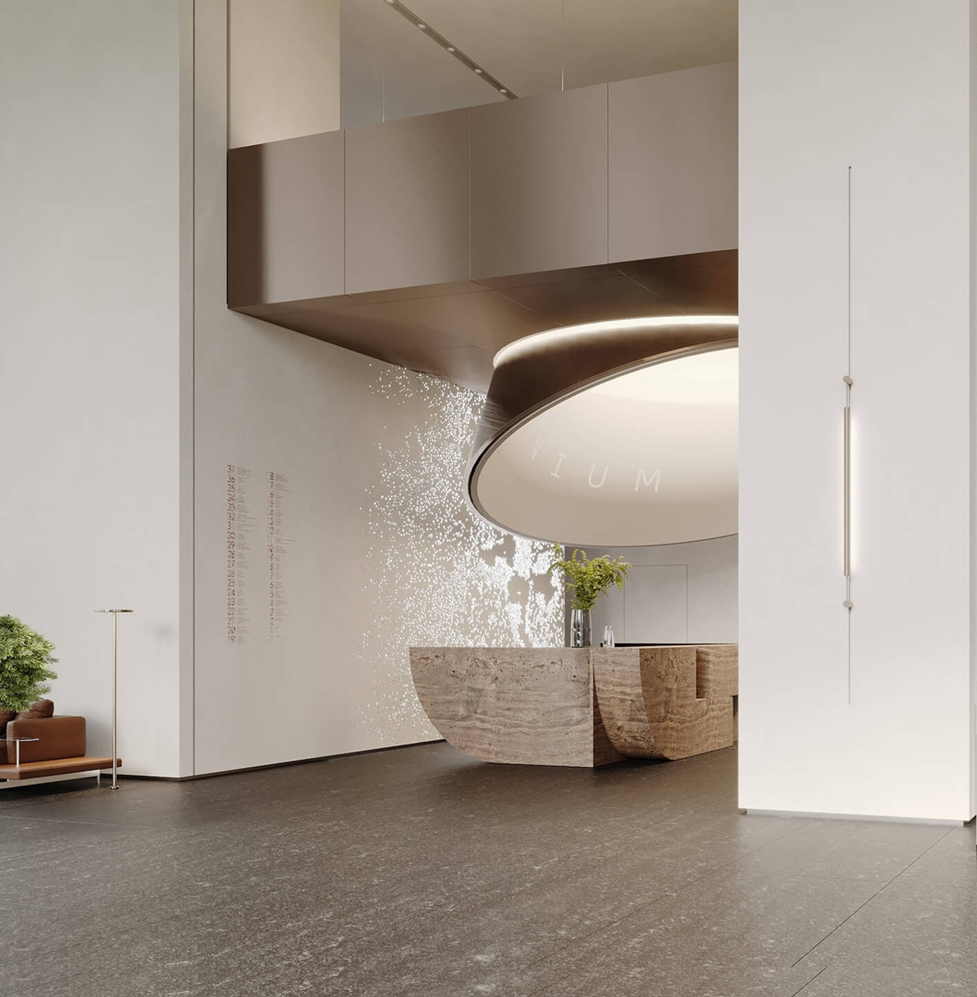 Дизайн вдохновлен историей места — «Песчаные улицы», эстетика Desert Art — художественного направления, объединяющего минимализм, природные формы и пустынные пейзажи, нашедшего отражение в лаконичных и тактильно чистых интерьерных решениях.